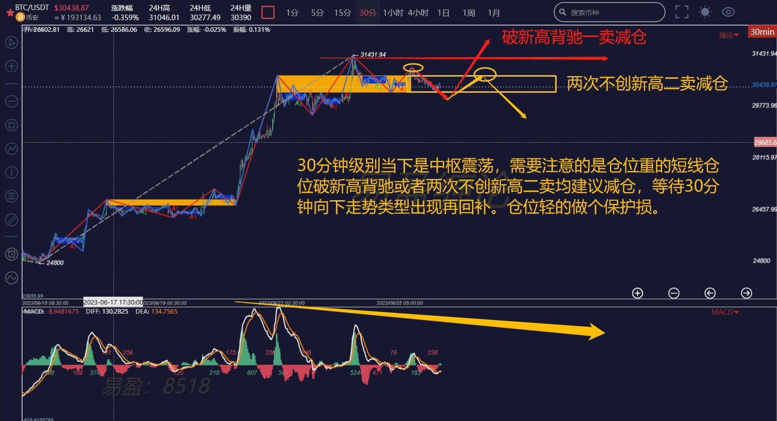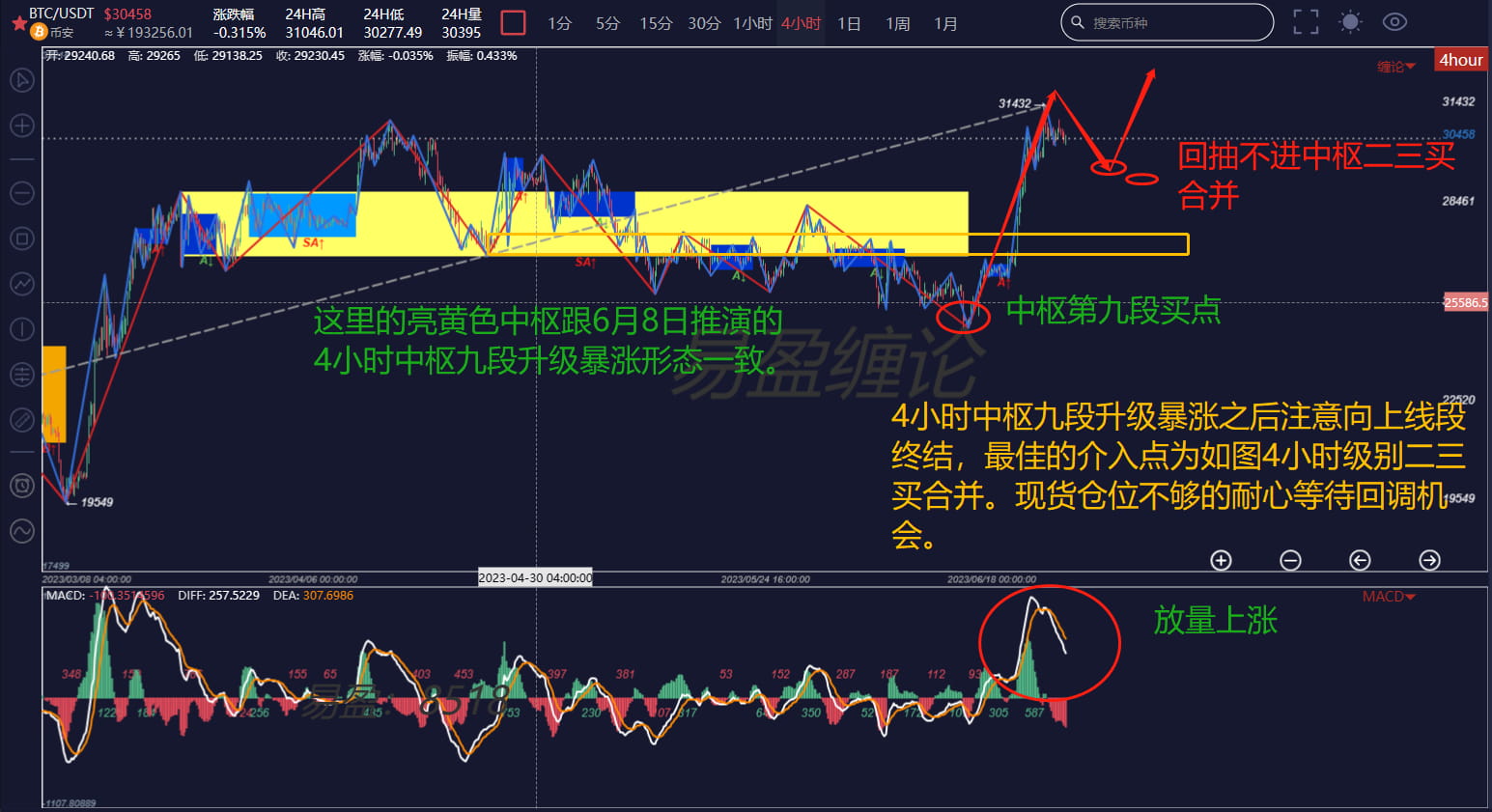再看4小时图,这张图跟6月8日的4小时图对比走势基本一致!当下需要关注的重点是4小时第九段向上线段何时终结,向下回抽不进中枢二三买合并就是我们要重点介入的位置,之前踏空或者仓位没上够的,就耐心等待这个4小时买点坚定上车!低位上车的筹码继续持有,仓位重的在30分钟出卖点的时候做短差,等待4小时买点出现。