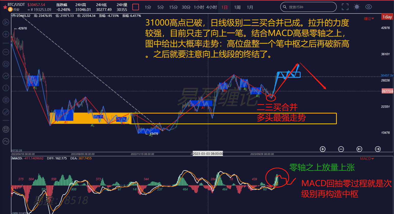 日线级别二三合并多头最强走势的威力已经初显!从低点24800到破新高仅仅只是走了日线级别向上的一笔,并且还没确认这一笔走完。日线级别二三买合并的成立预示着未来一段行情都将由多头掌控,至于这一段能涨到哪里涉及到预测,但一定要给出一个点位的话,本号认为日线级别左侧中枢的下沿33000附近是有机会去挑战的。
