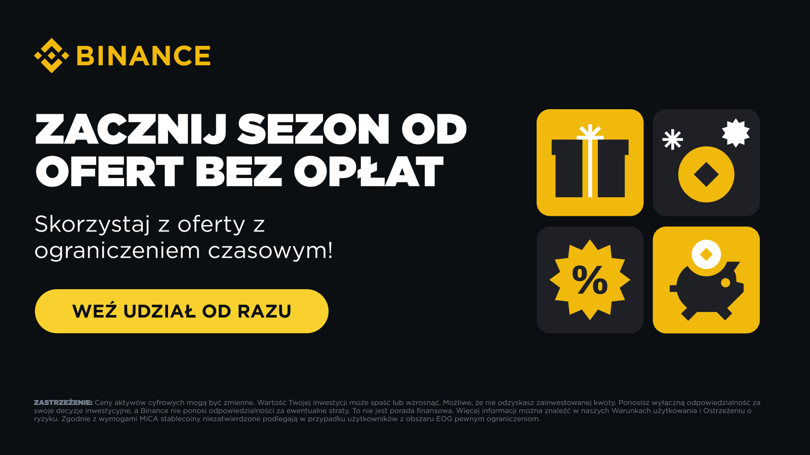 Ostrzeżenie o Ryzyku: Ceny aktywów cyfrowych podlegają wysokiemu ryzyku rynkowemu i zmienności cenowej. Wartość Twojej inwestycji może spaść lub wzrosnąć i możesz nie odzyskać zainwestowanej kwoty. Ponosisz wyłączną odpowiedzialność za swoje decyzje inwestycyjne, a Binance nie ponosi odpowiedzialności za ewentualne straty. Wyniki osiągnięte w przeszłości nie są wiarygodnym prognostykiem wyników na przyszłość. Inwestuj tylko w produkty, które znasz, i tylko jeżeli rozumiesz ryzyko. Przed dokonaniem jakiejkolwiek inwestycji należy dokładnie rozważyć swoje doświadczenie inwestycyjne, sytuację finansową, cele inwestycyjne i tolerancję na ryzyko oraz skonsultować się z niezależnym doradcą finansowym. Niniejszego materiału nie należy interpretować jako porady finansowej. Aby uzyskać więcej informacji, zapoznaj się z naszymi Warunkami Użytkowania i Ostrzeżeniem o Ryzyku.