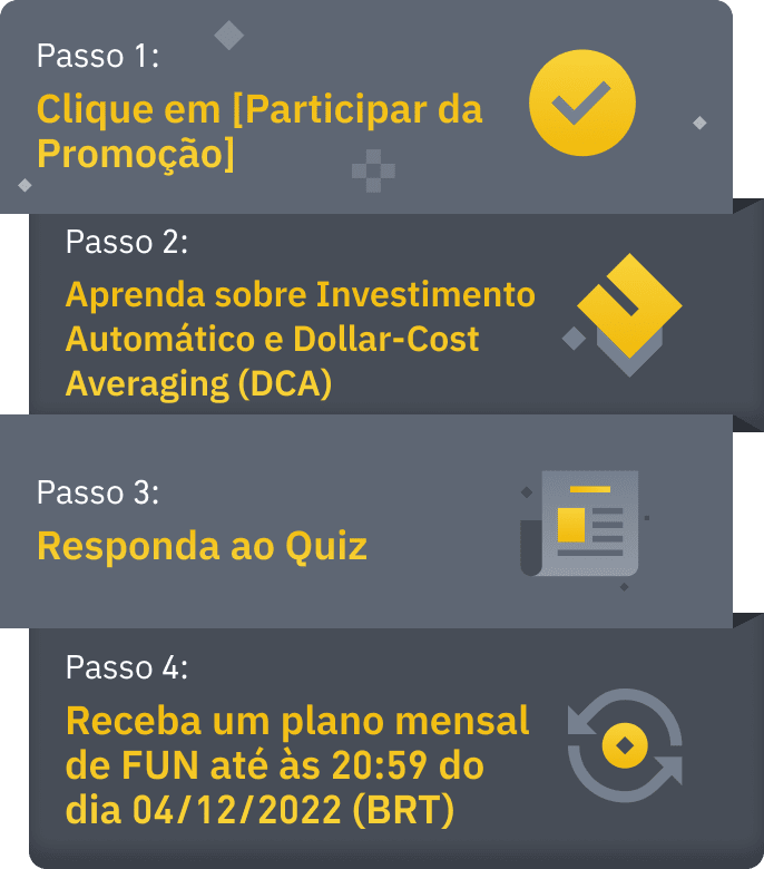 A Binance está lançando uma nova atividade de Quiz de Investimento Automático às 06:00 do dia 07/11/2022 (BRT), na qual os usuários podem adquirir conhecimento sobre Custo Médio em Dólar e Investimento Automático. Os primeiros 100.000 novos usuários de Investimento Automático que confirmarem a participação e completarem o quiz, durante o período da promoção, serão qualificados para receberem um plano mensal de Investimento Automático de FUN grátis, por cinco meses.