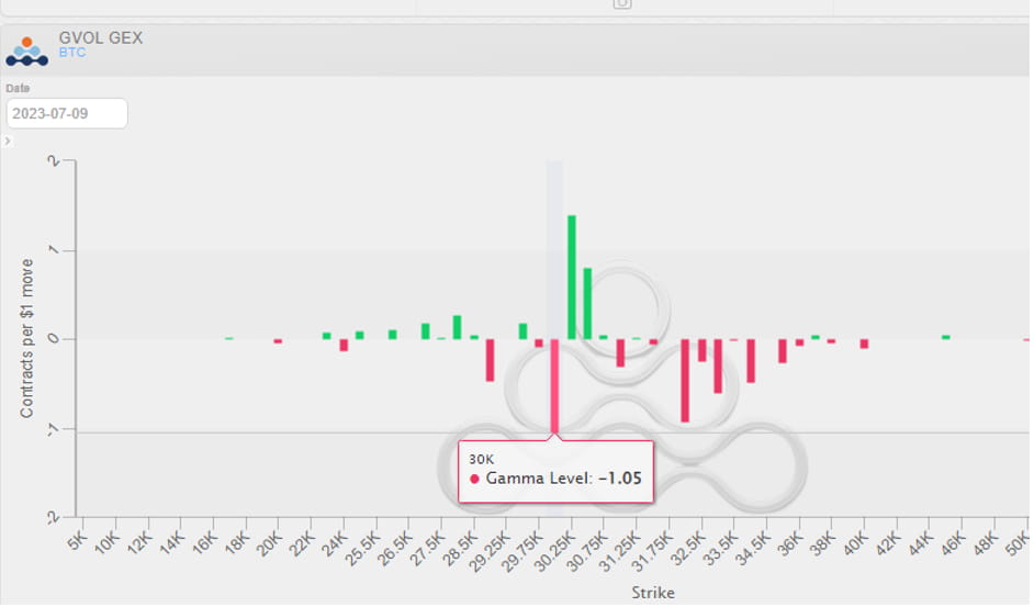 从数学意义上Gamma是期权价格二阶偏导,如果对希腊字母不清楚的小伙伴可以翻看我的期权专栏,有专门希腊字母的描述。也可以查看期权学院初阶课程,当时我做过专门讲解。描述的主要就是Delta对标大饼这类标的资产的价格敏感度。平值期权附近的Gamma最大,此时较小的大饼价格变动都会引起较大delta变动从而带动Gamma更大跳动,而OTM和ITM期权的Gamma均类正态分布趋近于0。因为sell options的Gamma为负值,所以一些人总认定最大-Gamma的Gex值为最大痛点,其实是一种谬误(例如下图说3W是最大痛点这类描述)。