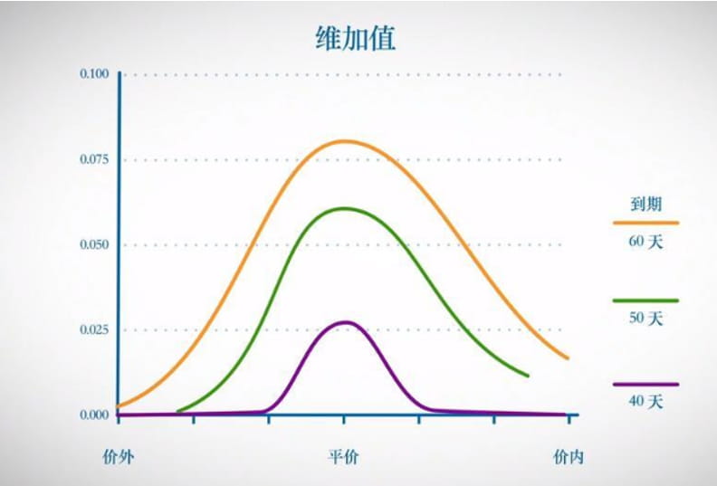 下图为不同到期日期权合约Gamma的差异,简单粗暴不太科学的讲就是越短周期Gamma影响越大,而vega正好相反。(2张图对比看,对希腊字母的理解就更深刻了)
