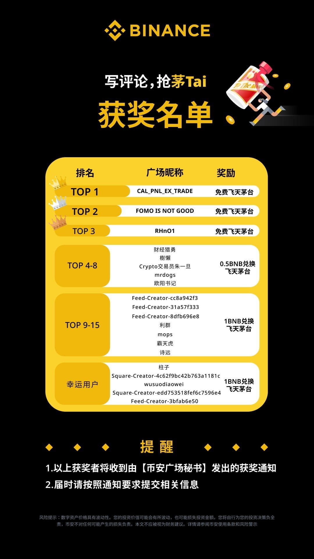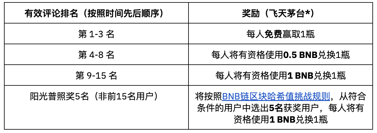 A Binance selecionará 20 vencedores com base na ordem em que os usuários enviam comentários válidos. Os usuários qualificados podem ganhar Feitian Moutai grátis de acordo com a estrutura de recompensa na tabela abaixo ou usar o desconto ultrabaixo do BNB para resgatar Feitian Moutai. Primeiro a chegar, primeiro a ser servido, você está convidado a participar.