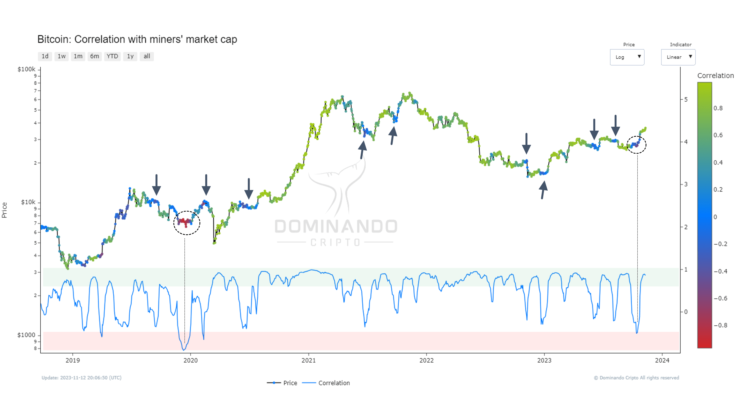 To facilitate understanding and aid in analyzing when Bitcoin is more correlated with the Market Cap of mining companies, a correlation heatmap has been created. Something unexpected emerges here: when the correlation is low or negative between Bitcoin and miners, the price of Bitcoin undergoes significant trend changes, making it an excellent sentiment indicator. Recently, it indicated a negative correlation at the same level as the end of 2019, suggesting that the BTC price moved in one direction while miner stocks moved in another.
