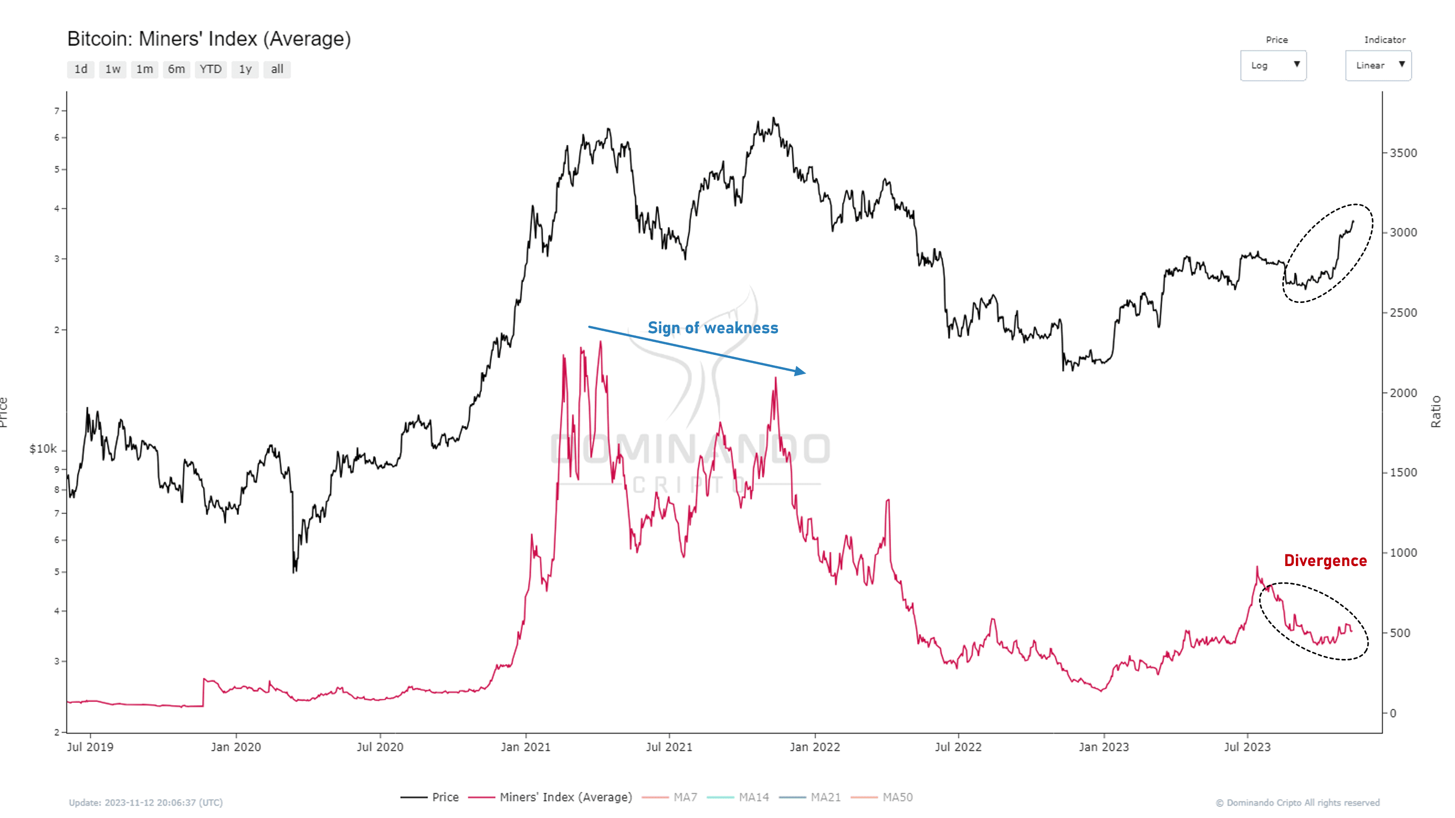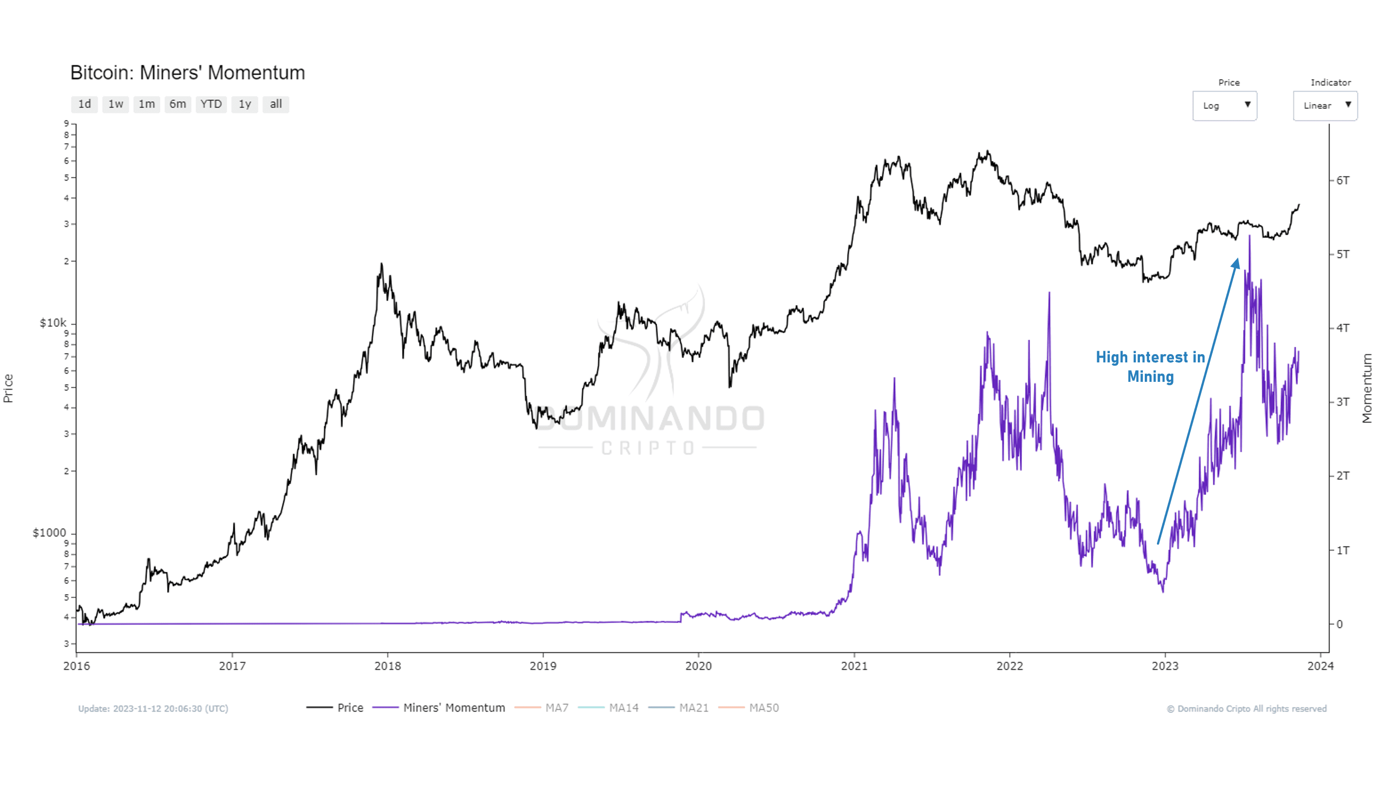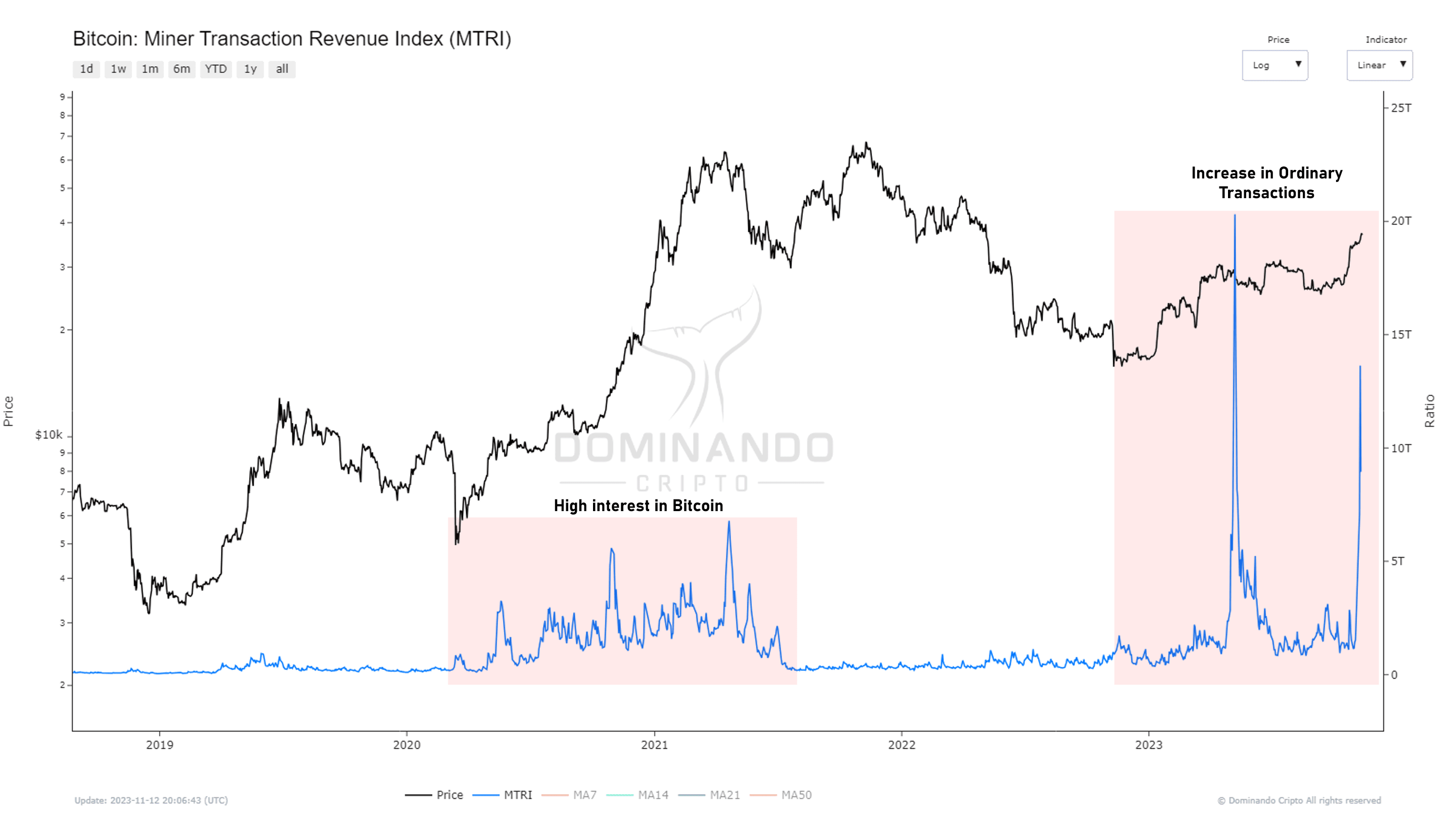 The Miner Transaction Revenue Index is an indicator that monitors and assesses the revenue generated by miners participating in the Bitcoin network. This metric takes into account processed transactions along with transaction fees associated with those transactions, reflecting the compensation miners receive for transaction validation and network security. The index offers a comprehensive view of the financial health of miners in the Bitcoin ecosystem and is crucial for understanding the economic sustainability of the network, as well as the attractiveness of Bitcoin mining for network participants. Recent high values refer to the number of Ordinals, something on the rise in the network since early 2023. However, we can consider that the recent increase is different from the actual demand we saw between 2020 and 2021 when interest in Bitcoin was high.