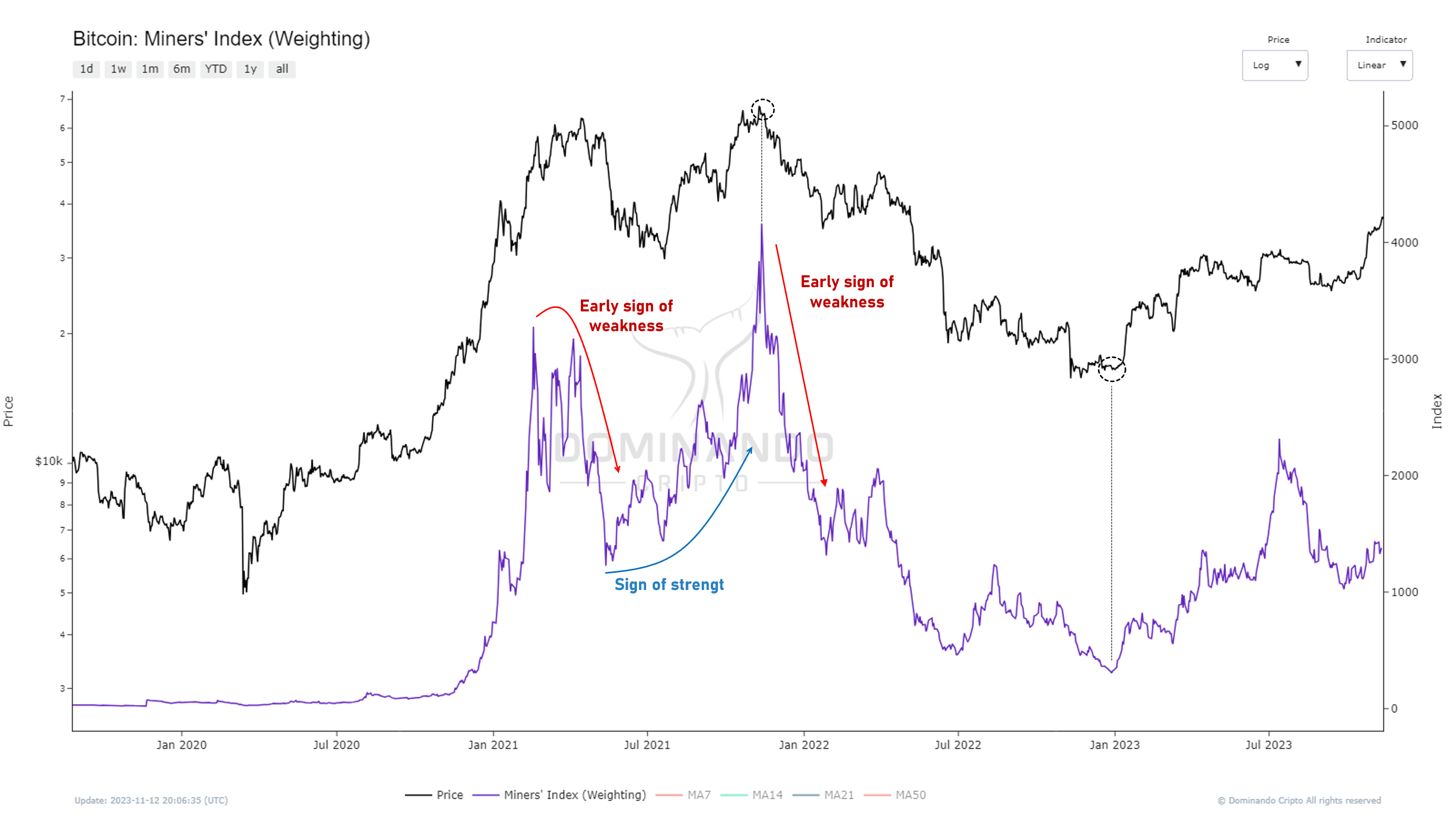 For better comprehension, we have developed the Miners' Index (Weighting). The result is an indicator demonstrating that miners see their stocks decline before a downturn in BTC. In other words, miners anticipate Bitcoin movements. This indicator reveals how important miners are to Bitcoin, considering they hold a significant amount of BTC in their reserves.