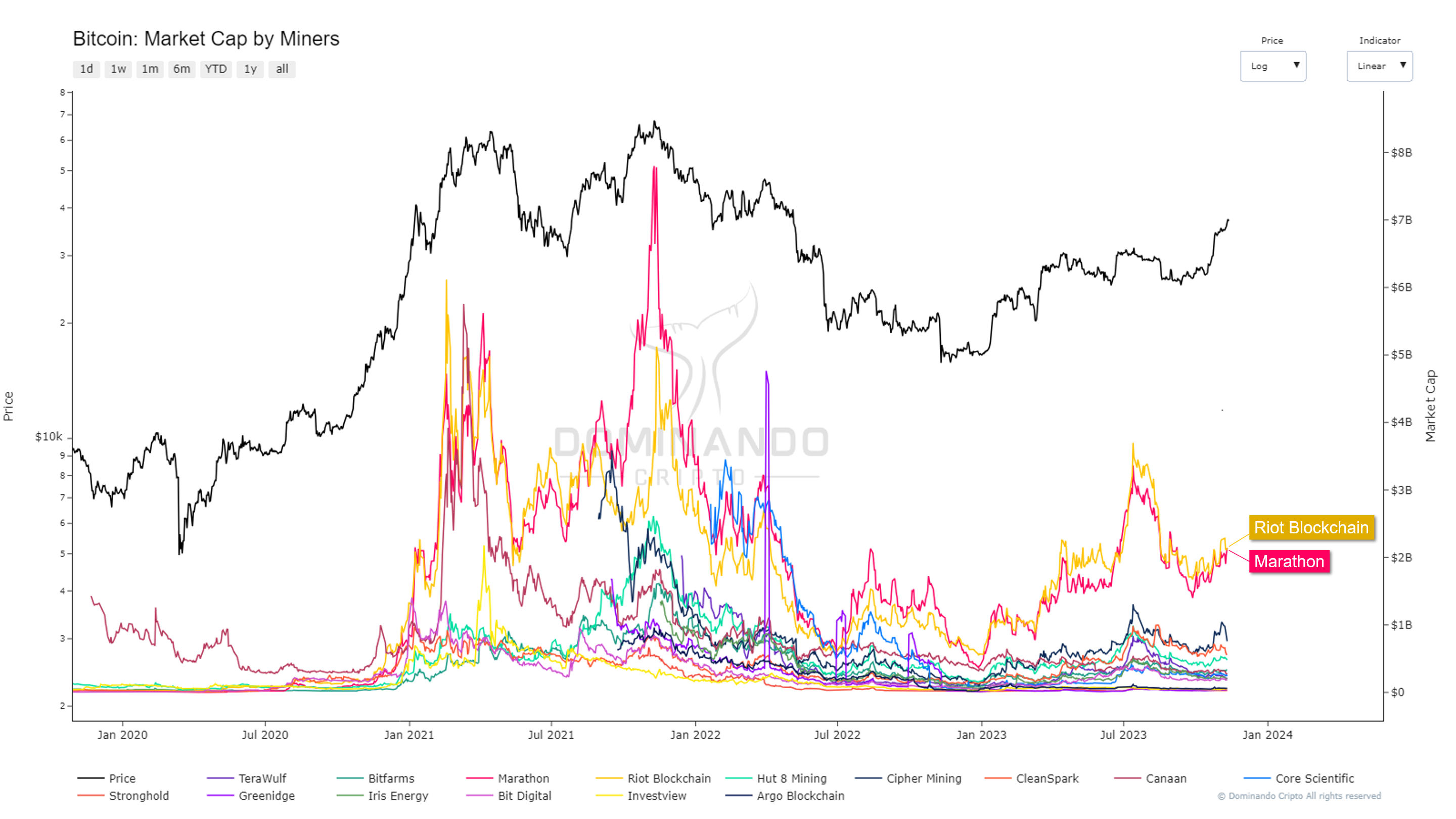 The second one shows the aggregated Market Cap of these companies, serving as a powerful indicator for comparison with Bitcoin and cryptocurrencies in general. The peaks coincide with those of Bitcoin, underscoring the significant importance of mining in cryptocurrencies.