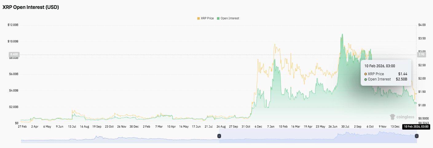 Os dados de derivativos de XRP refletem um ciclo de alavancagem completo. O interesse aberto aumentou acentuadamente no final do 4T à medida que o preço subiu. Subsequentemente, o interesse aberto em declínio seguiu a volatilidade crescente. Portanto, liquidações forçadas e fechamento de posições reduziram a exposição especulativa. Apesar da ocasional estabilidade de preços, a convicção em alavancagem continuou a diminuir.