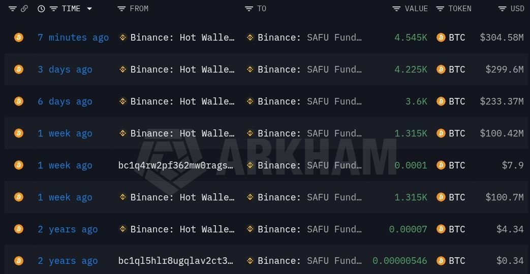De acordo com dados rastreados publicamente, a Binance alocou aproximadamente $304 milhões em BTC em uma transferência recente, levando a reserva SAFU a aproximadamente 15.000 BTC, avaliados em cerca de $1 bilhão nos níveis atuais de mercado.