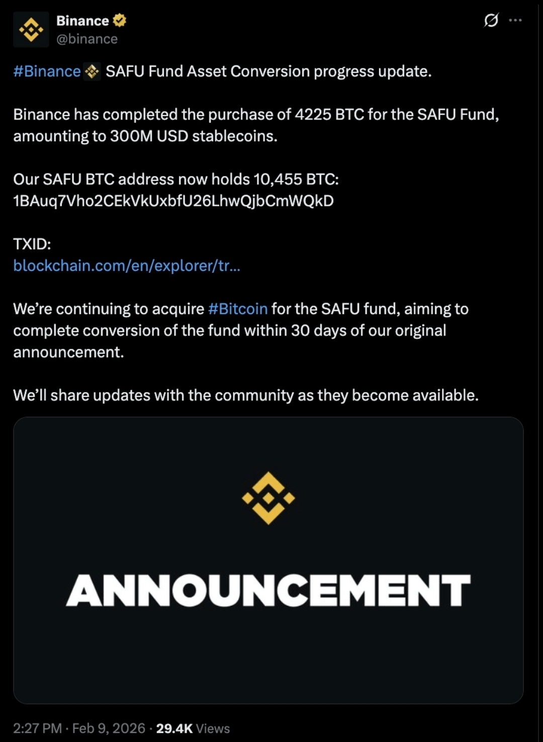 Em 2026, a Binance anunciou uma grande mudança estrutural: a reserva SAFU seria mantida principalmente em Bitcoin em vez de stablecoins. Isso marcou uma mudança na composição da reserva, alinhando o fundo com o Bitcoin como o ativo dominante dentro do ecossistema cripto.