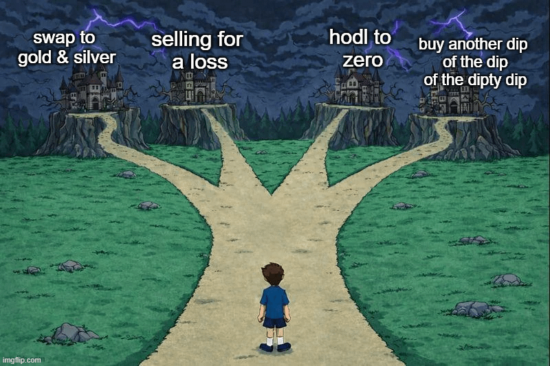 Esse tipo de meme captura a sensação de bifurcação no caminho agora: vender em pânico e se arrepender depois, ou reconhecer a queda pelo que é, uma chance de comprar Bitcoin com desconto antes do próximo impulso para cima.