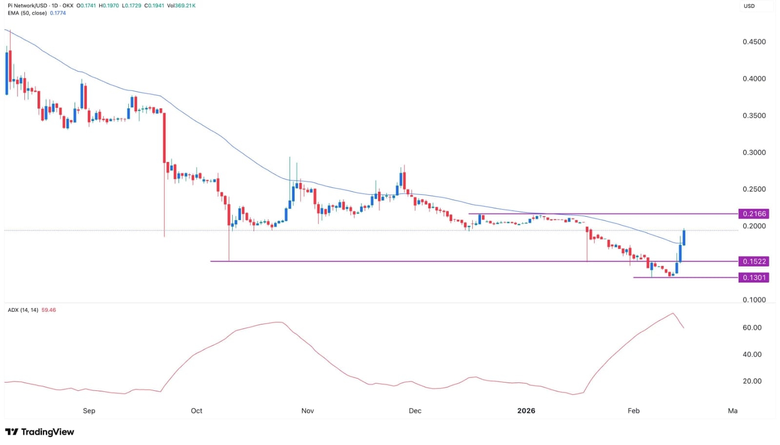 O gráfico do período diário mostra que o preço da Pi Network atingiu o fundo em $0.1300 este mês e se recuperou nos últimos dias. Ele se recuperou para um máximo de $0.1965, seu nível mais alto desde 19 de janeiro.