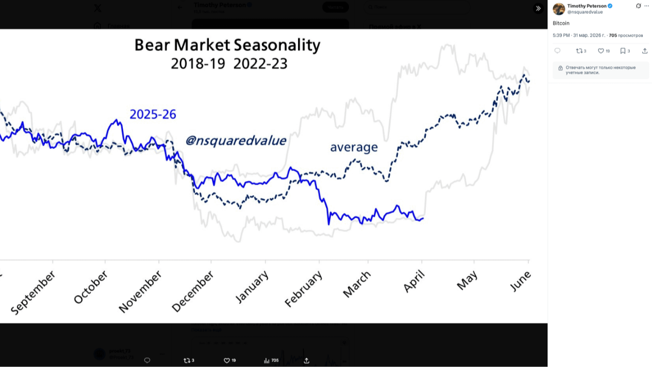 No gráfico, o analista Timothy Peterson (nsquaredvalue no X) compara a trajetória típica das fases de baixa do #BTC de 2018-2019 e 2022-2023, bem como o cenário médio, e sobrepõe ao gráfico o mercado atual de 2025-2026.
