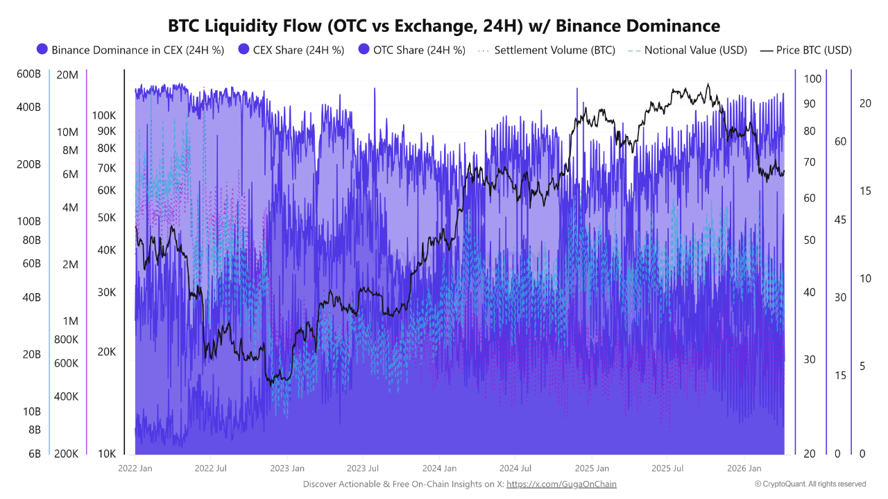 Com as tensões entre os EUA e o Irã derrubando os mercados de ações e empurrando o petróleo acima de $114, o Bitcoin ($68.6K) mostra como o Dinheiro Inteligente reage ao medo: saindo das telas. Dos $32.7B movimentados nas últimas 24h, o capital institucional absorveu impressionantes 82.15% via balcão (OTC), protegendo-se do choque geopolítico.