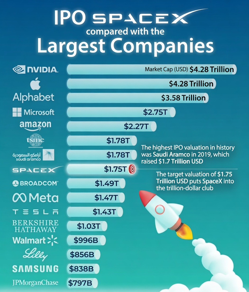 According to Reuters, a potential IPO could target a $1.75 trillion valuation. If that happens, SpaceX would become the 6th largest publicly listed company in the U.S., with the ability to raise up to $75 billion.