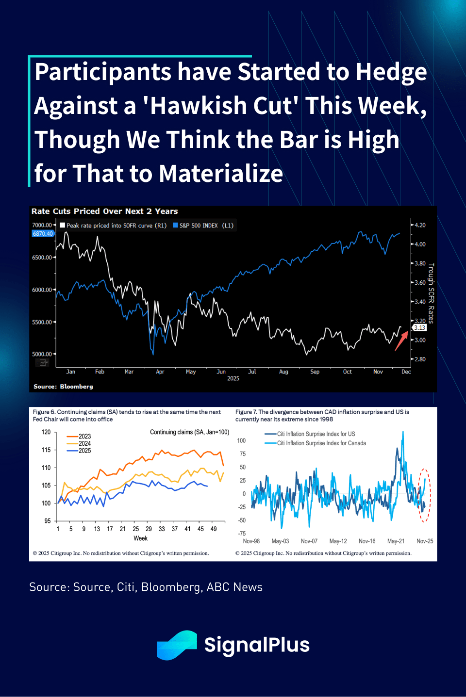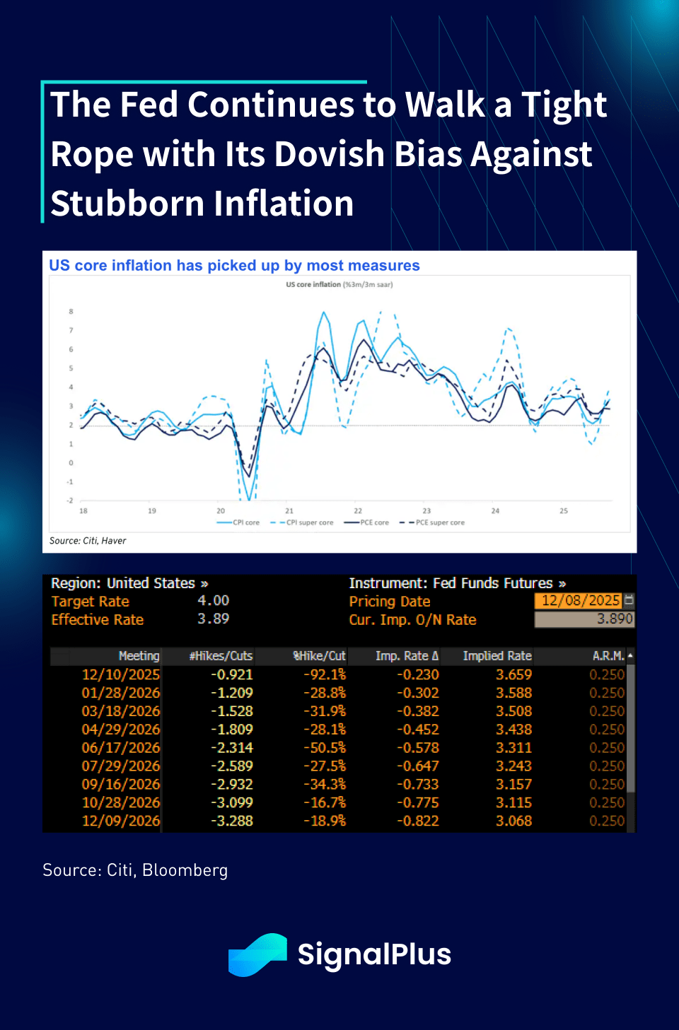 Sem surpresa, a posição dovish do Fed está começando a encontrar alguma resistência no mercado, com participantes do mercado começando a precificar a chance de um ‘corte hawkish’ através da orientação de Q&A de Powell ou uma mudança nas previsões do SEP. Para que isso aconteça, o Fed precisaria ser bastante explícito em sua orientação futura, como mudando as expectativas de cortes de taxa de 2026 para 1 ou menos, o que acreditamos ter uma baixa probabilidade de acontecer.