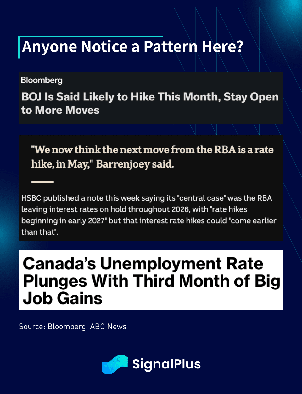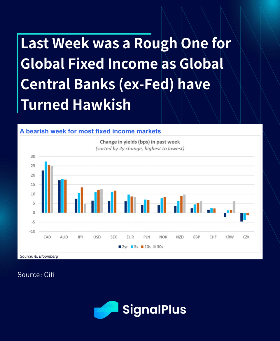 Enquanto o sentimento de risco se estabilizou na semana passada, a renda fixa do G7 teve um desempenho ruim, uma vez que vários indicadores econômicos de Tier-1, não dos EUA, surpreenderam para cima. O CPI da Austrália ficou em 3,8% contra 3,6% esperado, desencadeando um aumento de 15 pontos base em seu rendimento de 5 anos e o AUDUSD +2,5% mais alto no mês. O relatório de empregos do Canadá foi o próximo, com uma superação extremamente forte (desemprego em 6,5% contra 7,0% esperado), o que desencadeou o maior movimento diário nos títulos canadenses de 5 anos desde 2022 (+20 pontos base), e o CAD subindo 2%. No Japão, apesar do fraco gasto em capex, o mercado está precificando uma chance de 90% de um aumento do BOJ neste mês, tornando o Fed dovish o estranho no G7.