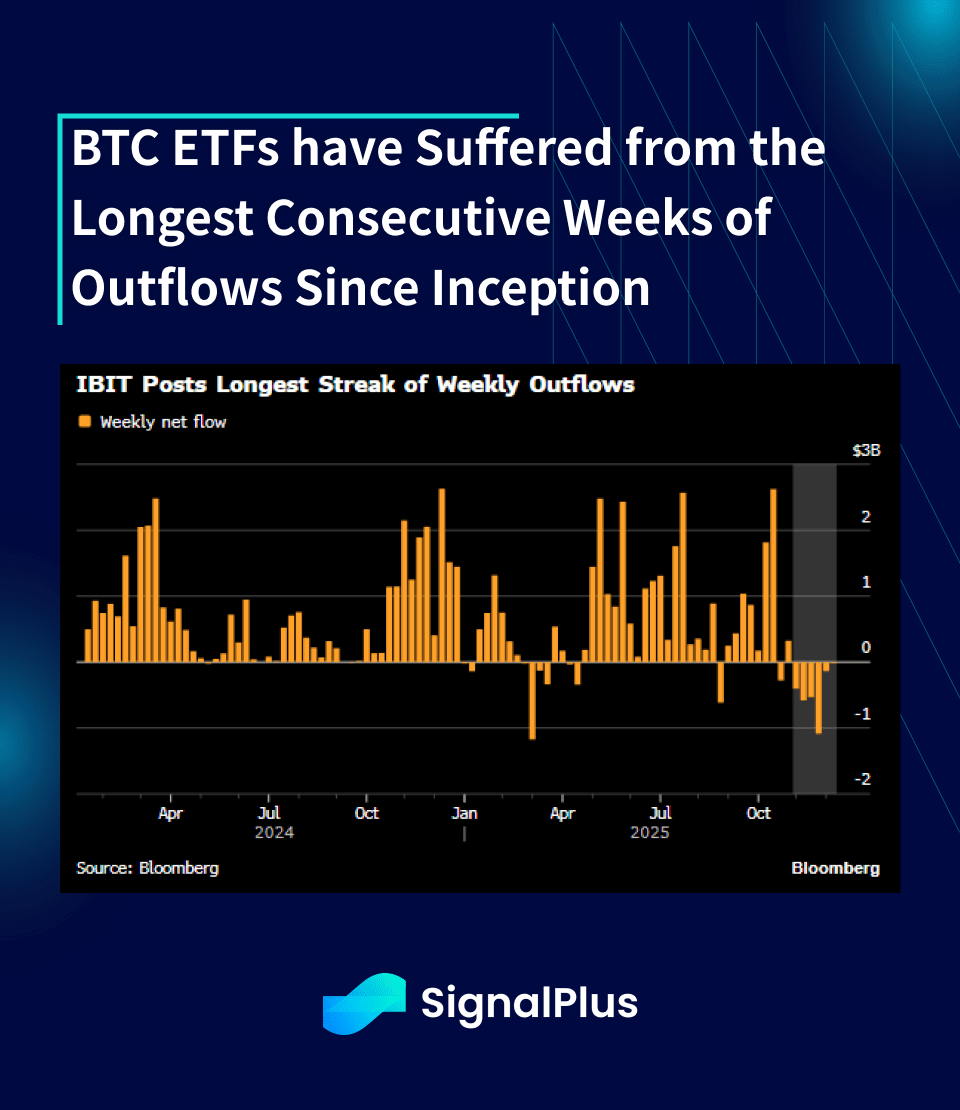 Tudo isso não significou muito para o cripto, que viu os preços do BTC recuperarem para a faixa de preço de 86–92k após uma semana de negociação tranquila. Infelizmente, o sentimento subjacente parece ter mudado para pior, já que o IBIT da Blackrock sofreu sua maior sequência de saídas semanais desde a criação, com quase $2.9bln de saídas cumulativas nas últimas 6 semanas consecutivas.