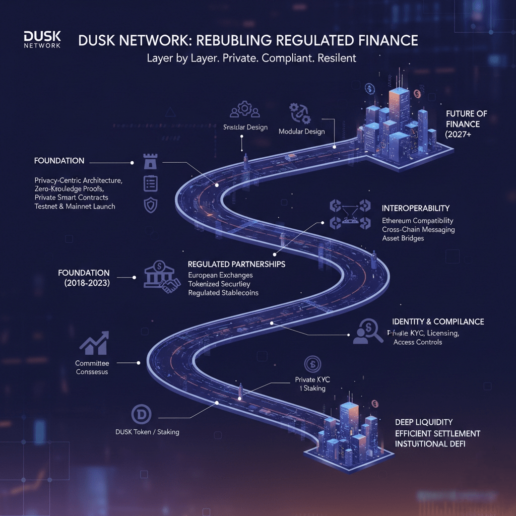 Olhando para o futuro, o roadmap da Dusk permanece consistente com sua visão original. Os planos focam na expansão dos ambientes de execução, aprimoramento da interoperabilidade e integração de parceiros regulamentados adicionais. Ferramentas de identidade e conformidade continuam a evoluir, permitindo KYC, licenciamento e controles de acesso sem comprometer a privacidade do usuário. Se bem-sucedido, isso poderia permitir aplicativos descentralizados que se assemelham a plataformas financeiras tradicionais em forma, enquanto se beneficiam da eficiência da blockchain nos bastidores.