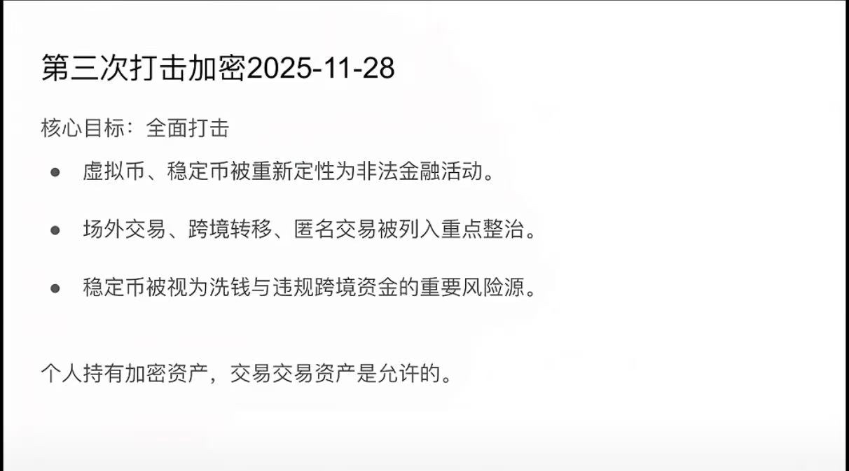 Qual foi o impacto das três repressões da história sobre as criptomoedas no mercado? Foram em 4 de setembro de 2017, 18 de maio de 2021 e 28 de novembro de 2025. Após a declaração de 4 de setembro de 2017, o Bitcoin caiu de 5000 para 3000, uma queda de 30%. O efeito seguinte foi que muitas exchanges fecharam e o canal de compra direta de Bitcoin com moeda fiduciária foi eliminado. Em 18 de maio de 2021, o Bitcoin caiu de 60 mil para 30 mil, uma queda de 50%. Esta vez, o impacto no mercado foi considerável e, historicamente, a amplitude da queda foi grande. Recentemente, o Bitcoin despencou de 91000 para 90800, uma queda de cerca de 0,2%. Esses eventos já não têm muito impacto no mercado de criptomoedas, então as pessoas não precisam mais se preocupar se haverá uma nova declaração, mas devem prestar atenção nas políticas e no capital dos EUA e seu impacto no mercado. Isso porque a China já não tem influência sobre este mercado, pois ele já não se preocupa mais com o que eles dizem. Para entender melhor, a primeira repressão foi em 2017, com o objetivo central de cortar o financiamento e as transações, pois os ICOs estavam muito desenfreados, qualquer um que apresentasse um white paper conseguia subir em uma exchange e registrar aumentos de dezenas ou centenas de vezes. Naquela época, era muito fácil ganhar dinheiro, a especulação era muito fácil. Então, foi proibido qualquer instituição financiar tokens, as exchanges foram fechadas, e moeda fiduciária não pôde ser trocada diretamente por criptomoedas. A segunda repressão foi em 18 de maio de 2021, focando principalmente em cortar os canais de pagamento e bancários, impossibilitando o fornecimento de capital para o mercado de criptomoedas, reafirmando que moedas virtuais não são moedas. Outro ponto importante foi a repressão total à indústria de mineração. Por exemplo, os mineradores que haviam investido em pequenas usinas elétricas em Sichuan, que tinham investido centenas de milhões em minas de Bitcoin, foram expulsos em poucos dias, resultando em grandes perdas. Após 2021, a mineração doméstica foi completamente eliminada, basicamente se mudaram para o terceiro mundo ou para a Rússia, e os EUA e o Canadá se tornaram o maior mercado de poder computacional. Mas dizem que a capacidade computacional da China voltou a ser a terceira, o que pode ser compreensível para todos. Esta é a terceira repressão, que ocorreu recentemente, em 28 de novembro de 2025. O objetivo agora continua sendo a repressão total, mas eles já não têm influência alguma sobre este mercado, que não apresenta grandes oscilações. No entanto, penso que é importante para todos no mundo das criptomoedas notar que a redefinição de stablecoins e moedas virtuais como atividades financeiras ilegais enfatiza a transferência transfronteiriça, negociações de balcão e a lavagem de dinheiro com stablecoins. O que é importante é que possuir ativos criptográficos ou ativos de negociação não traz problemas para você pessoalmente. Porém, se você for depositar ou retirar fundos, com o aumento do poder de combate à fraude, é fácil que todas as suas contas sejam bloqueadas. Há agora um novo documento acima, então não creio que isso afete as transações, mas pode impactar na questão de depósitos e retiradas. Portanto, tente fazer isso com pessoas de confiança, como comerciantes ou amigos com quem você costuma negociar, mesmo que tenha que pagar algumas taxas extras. Tente sempre trabalhar com conhecidos, pois se houver problemas, é mais fácil de resolver. É muito necessário ir a Hong Kong e obter alguns cartões de Hong Kong, e usar o canal de retirada em dólares de Hong Kong, isso você pode estudar por conta própria.$BTC