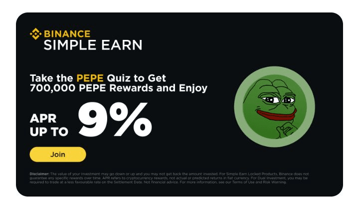 Binance Simple Earn apresenta promoções emocionantes para PEPE (PEPE)! Durante o período da promoção, novos usuários de Simple Earn Locked Products podem aprender sobre o PEPE e responder a um questionário para receber uma posição gratuita de 700.000 PEPE Locked Products cada. Além disso, os assinantes do PEPE em produtos flexíveis Simple Earn podem desfrutar de um APR exclusivo em níveis de bônus de até 9%, além das recompensas APR em tempo real.