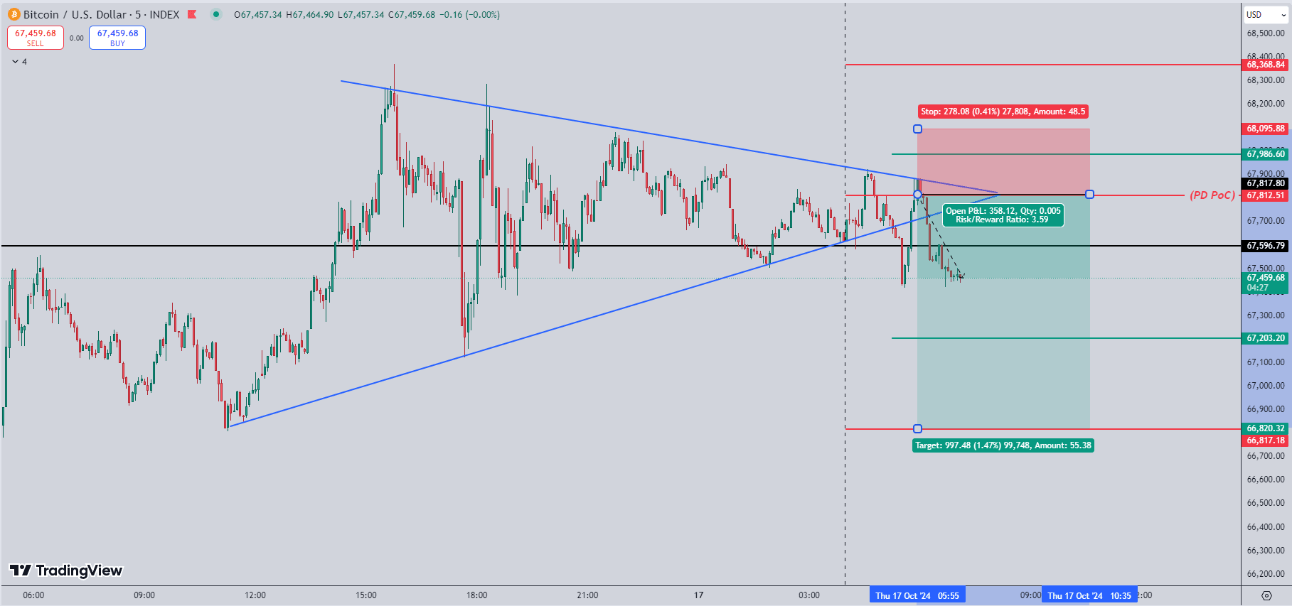 Piața Bitcoin poate fi volatilă, iar modelele tehnice ca acestea oferă oportunități bune atunci când sunt abordate cu prudență. Dacă impulsul de urs continuă, există șanse mari ca această poziție scurtă să-și atingă ținta, oferind un rezultat profitabil.