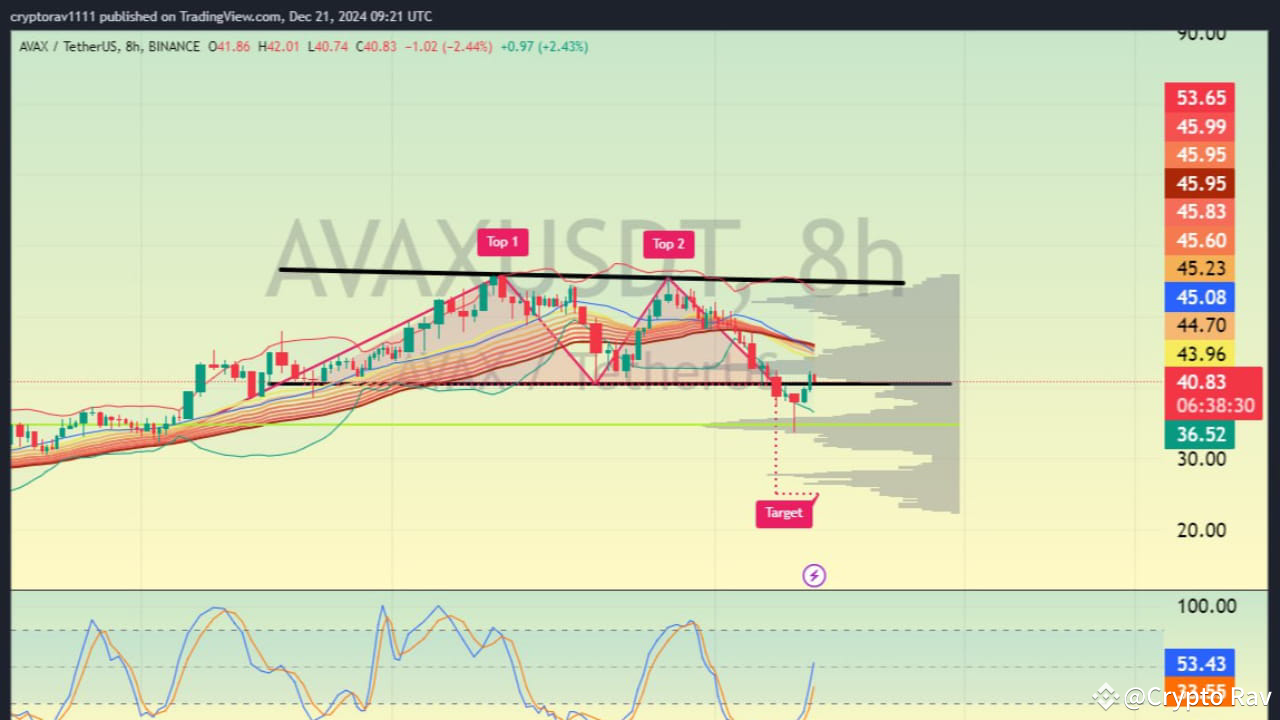 Graficul AVAX/USDT pe 8 ore reflectă o perspectivă bearish pe termen scurt. Modelul Dublu Vârf confirmă o cădere, cu un obiectiv aproape de $36.51. Stochastic RSI la 53.18 sugerează un moment neutru, dar semnalează o posibilă scădere suplimentară. RSI la 37.42 se aliniază cu momentum bearish. Benzile EMA s-au întors ca rezistență, indicând control bearish. Profilul de volum arată un suport semnificativ aproape de $36.50, unde cumpărătorii ar putea acumula. AVAX este bearish pe termen scurt, dar ar putea să se consolideze și să se recupereze pe termen lung, aliniindu-se cu sentimentul mai larg al pieței.
