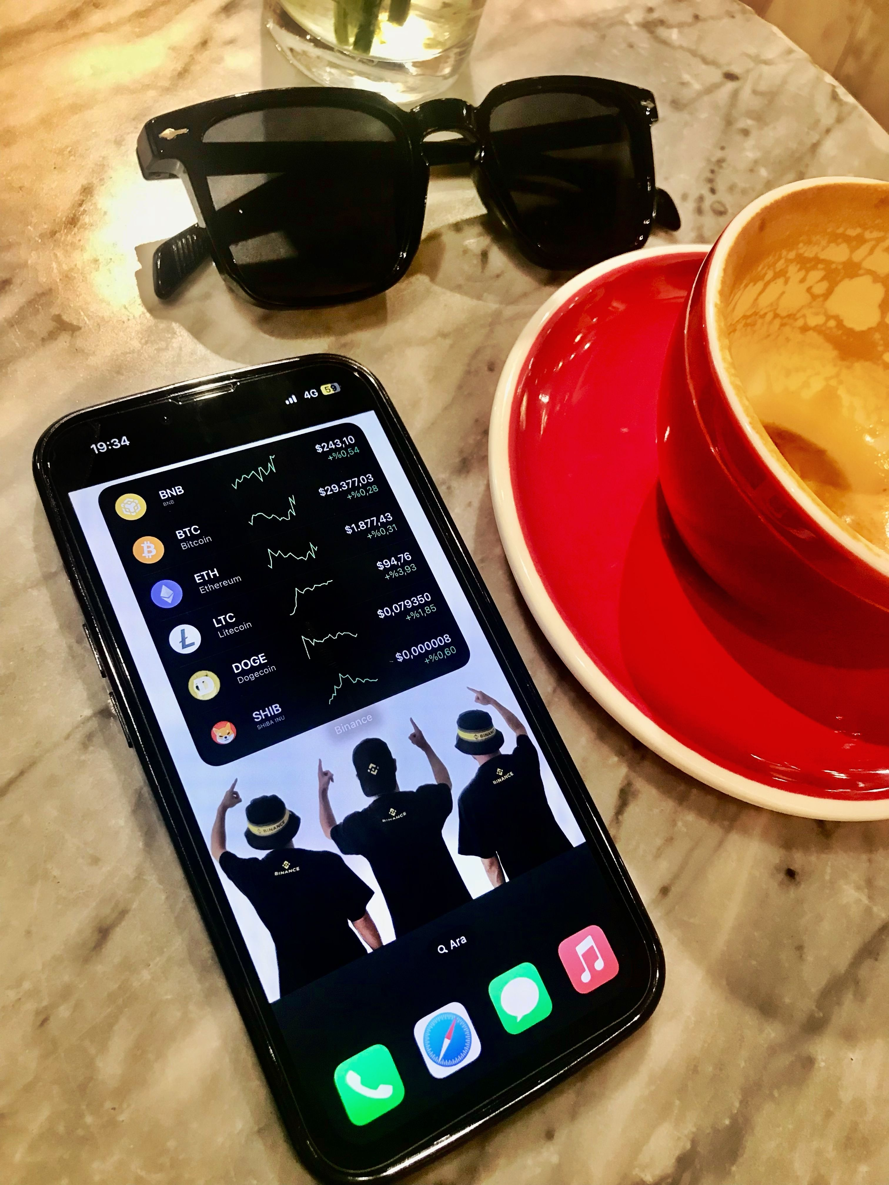 un telefon pe masă, o ceașcă de cafea, ochelari de soare lângă… și Bitcoin pe ecran 📱