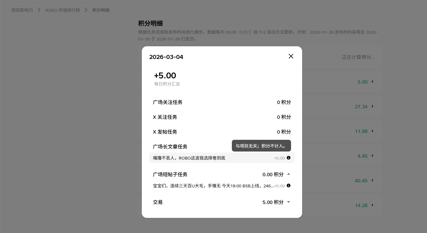 Încă în fiecare zi, în jur de ora două sau trei după-amiază, mă voi uita la scorul stabil al articolelor originale ROBO. Credeam cu entuziasm că astăzi voi avea peste 20 de puncte și voi urca multe poziții, dar cei 5 puncte m-au făcut să simt imediat că ceva nu este în regulă, așa că am deschis detaliile, și, într-adevăr, aveam doar 5 puncte de bază pentru tranzacții.