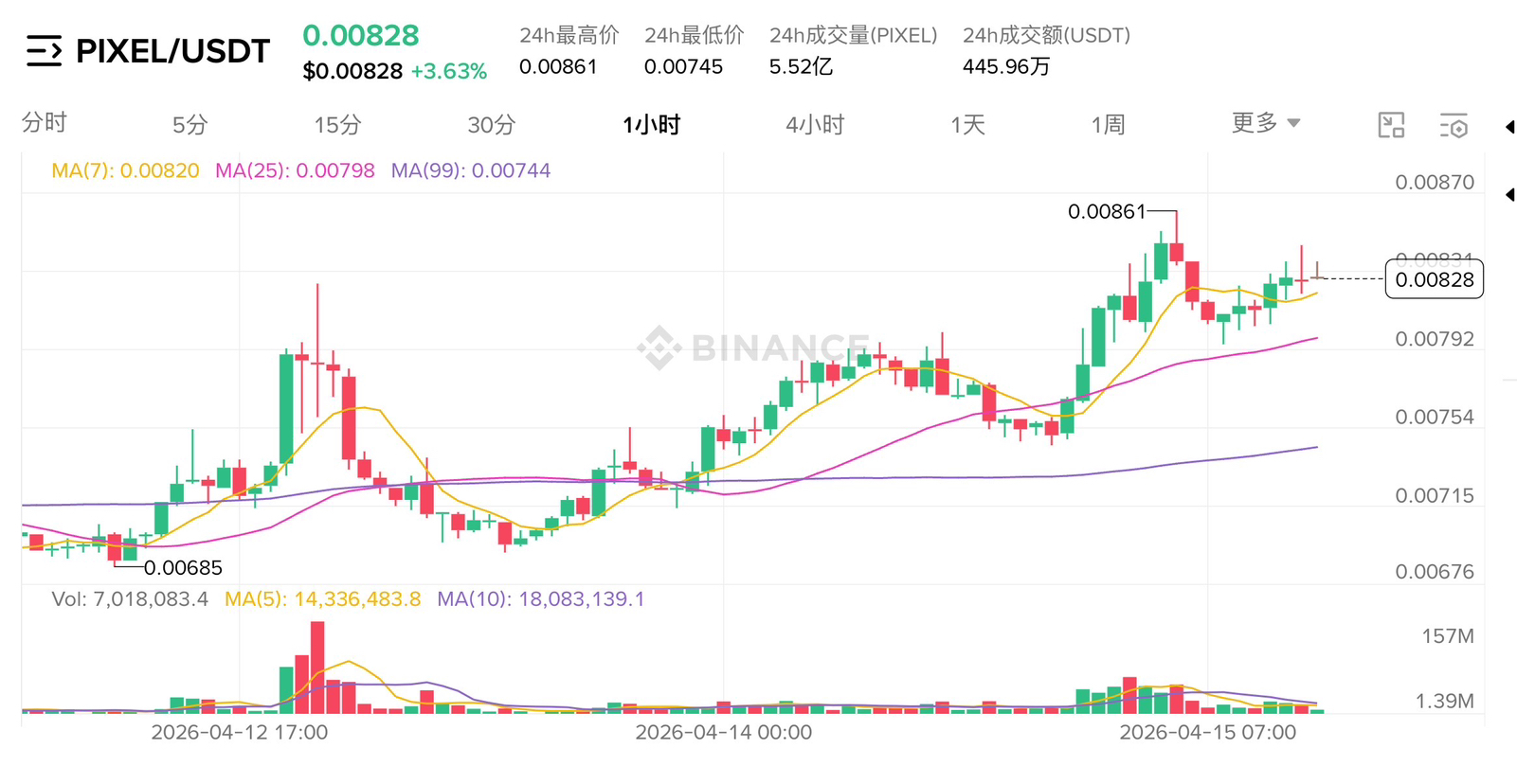 $PIXEL Momentan raportăm 0.00828 dolari, creșterea în ultimele 24 de ore +3.63%, maximul pe 24h a atins $0.00861, minimul $0.00745, volumul de tranzacționare 5.52 miliarde PIXEL, valoarea tranzacției 445.96 milioane USDT——volumul comparativ cu perioada anterioară s-a extins semnificativ, această schimbare de volum merită atenție. În structura mediei mobile, MA7 raportat la 0.00820 a depășit deja MA25 de 0.00798, MA99 se află în prezent la 0.00744 și continuă să crească, cele trei linii sunt în aranjament de tip bullish, de la minimul de $0.00685, recuperarea cumulată a depășit 20%. Acest @Pixels a lansat activitatea CreatorPad cu un premiu total de 15 milioane PIXEL, exclusiv pentru zona de limbă chineză 7.5 milioane PIXEL, termen limită 28 aprilie, numărul curent de participanți în zona de limbă chineză este 478. Studiu real · Prioritate pe viață, volumul și prețul se extind simultan, împreună cu aranjamentul celor trei linii bullish, această structură oferă o valoare de referință mai bună decât o simplă creștere a prețului, dacă se va putea menține MA7 fără a fi rupt este un semnal cheie pe care îl monitorizez constant.