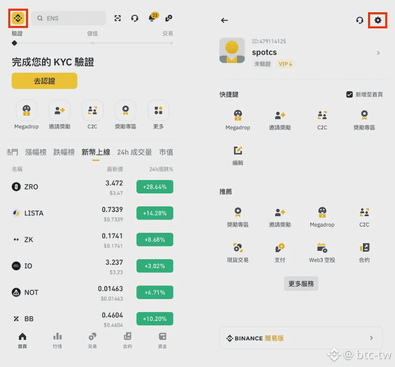 那要怎麼設定呢?首先先登入到幣安 app,進入到【帳號中心】。 點選右上方的【設定】。