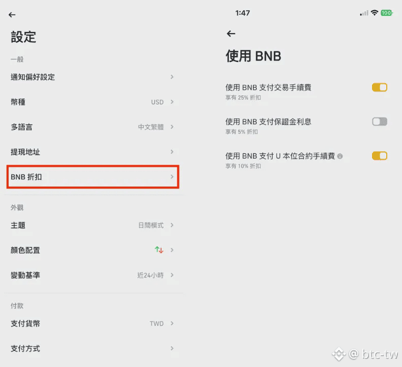 如果你今天有使用在你的帳戶中購買 BNB 幣,並且點擊用 BNB 折抵手續費,你就可以多獲得 25% 的手續費折扣(官方說明)。