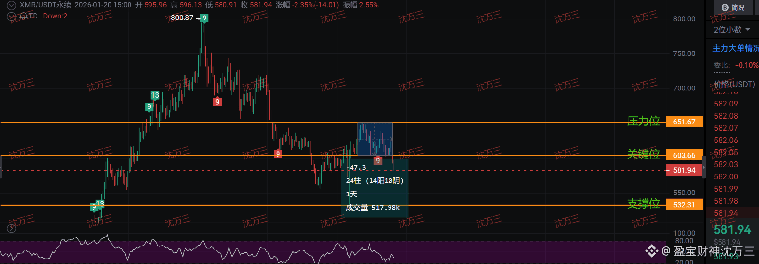 2026年1月20日15:00,XMR开盘595.96,收盘581.94,跌幅2.35%,振幅2.55%。关键价位603.66如同一道天堑,多次冲击未破,而压力位651.67更似悬顶之剑。支撑位532.31虽稳,但24柱14阳10阴的走势已现颓势——多头力量正在衰减,空头蓄势待发!