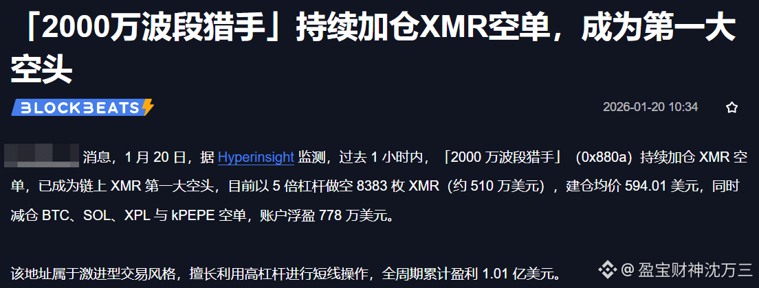 币圈如战场,一念天堂,一念地狱!当“2000万波段猎手”的空单席卷XMR,你是否还在盲目追涨?