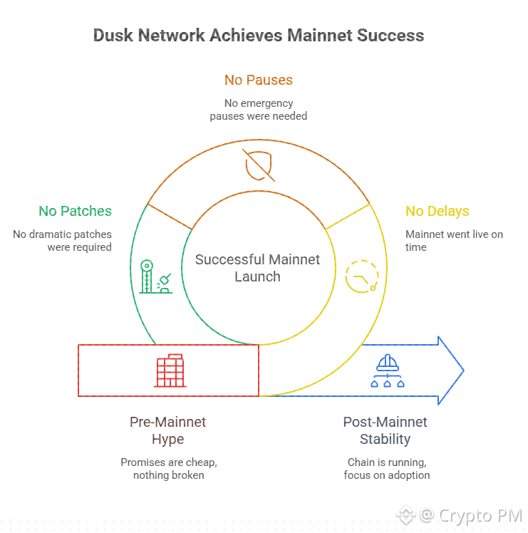 Mainnet went live on January 7 after six years of development. No delays. No emergency pauses. No dramatic patches. The chain is running, blocks are finalizing, and the focus has shifted away from launch optics toward adoption and execution. That alone puts Dusk in a very small minority.
