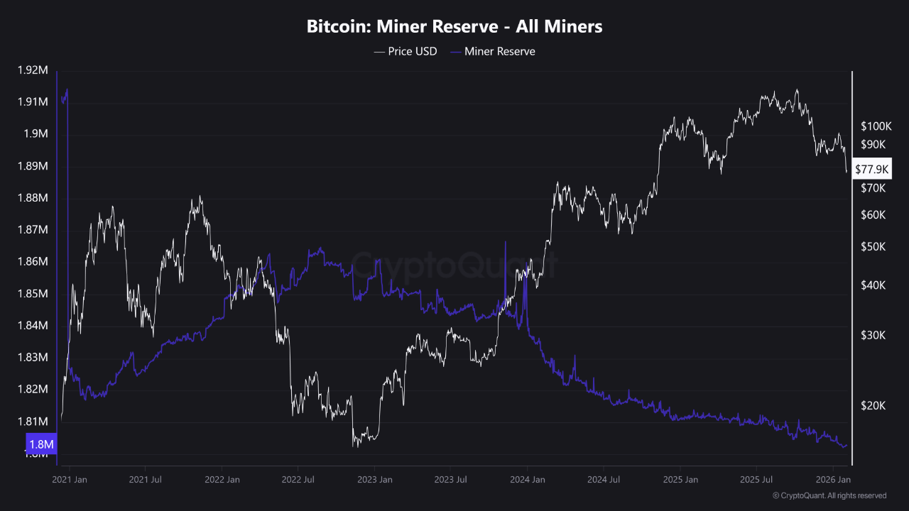 Dacă prețul continuă să scadă, acest efect se intensifică, crescând presiunea de a vinde rezervele minerilor, care astăzi se ridică la aproximativ 1.8 milioane BTC și au fost în scădere în ultimii patru ani.