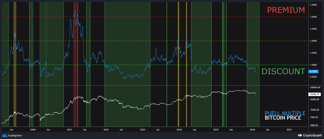 Ori de câte ori Puell Multiple atinge zona de Discount, reprezintă un moment bun pentru a acumula Bitcoin.