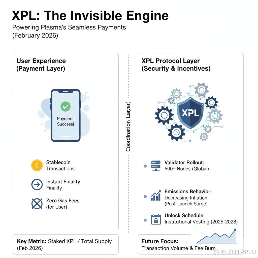 The XPL story, as I understand it from how Plasma explains it, sits more in the background as the coordination and security layer of the network instead of the thing users must constantly hold, and that separation is important because a payments focused chain usually wins when the user experience is simple while the incentive structure stays strong behind the scenes, so the details that matter most over time are the validator rollout, emissions behavior when decentralization expands, and the unlock schedule that shapes supply dynamics as the ecosystem grows.