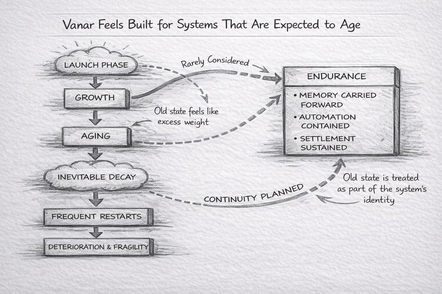 Sistemele economice care îmbătrânesc prost acumulează distorsiuni. Stimuli care au funcționat la început devin nealiniate mai târziu. Tokenurile concepute pentru creștere se luptă în timpul platourilor lungi. Infrastructura care presupune un impuls constant tinde să se fractureze atunci când activitatea încetinește.