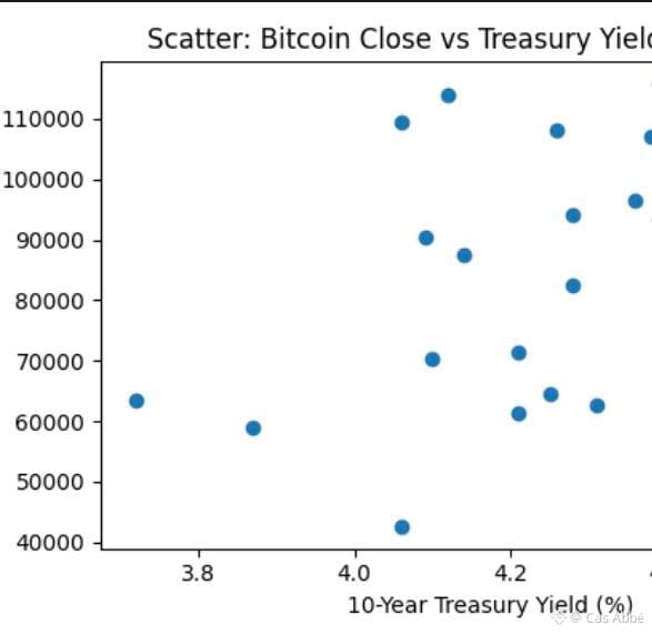 In the line chart, both series began to increase at the beginning of 2024, but the direction they take later is different. The fact that the scatter plot is widely dispersed proves that yields are not the only factors that affect Bitcoin.