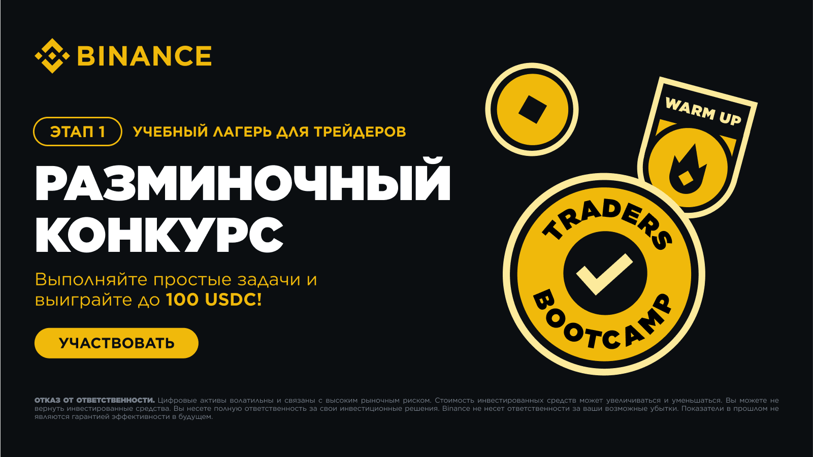 Во время первого этапа Учебного лагеря для трейдеров Binance мы запустим кампанию с заданиями и ограниченным сроком, которая включает в себя призовой фонд криптовалютных вознаграждений на сумму 500 000$ и несколько призов в форме ваучеров на ребейт, баллы Binance, токены DOGE, BNB и SOL, а также главный приз — 100 USDC, который будет разыгрываться ежедневно. Присоединяйтесь сейчас и готовьтесь к участию в Учебном лагере для трейдеров! Срок проведения промоакции: с 04.03.2025 03:00 по 01.04.2025 02:59 (UTC+3).
