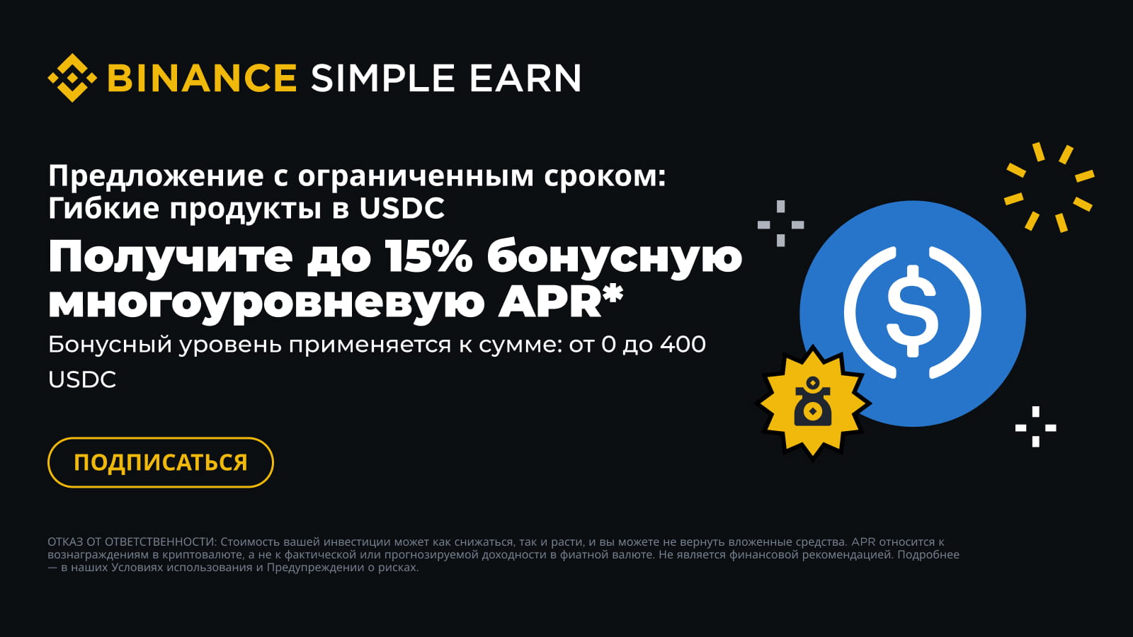 Награды в форме APR распределяются из собственных средств Binance и определяются на основе оценки и анализа преобладающих рыночных условий. Эта промоакция никак не связана с эмитентом USDC.