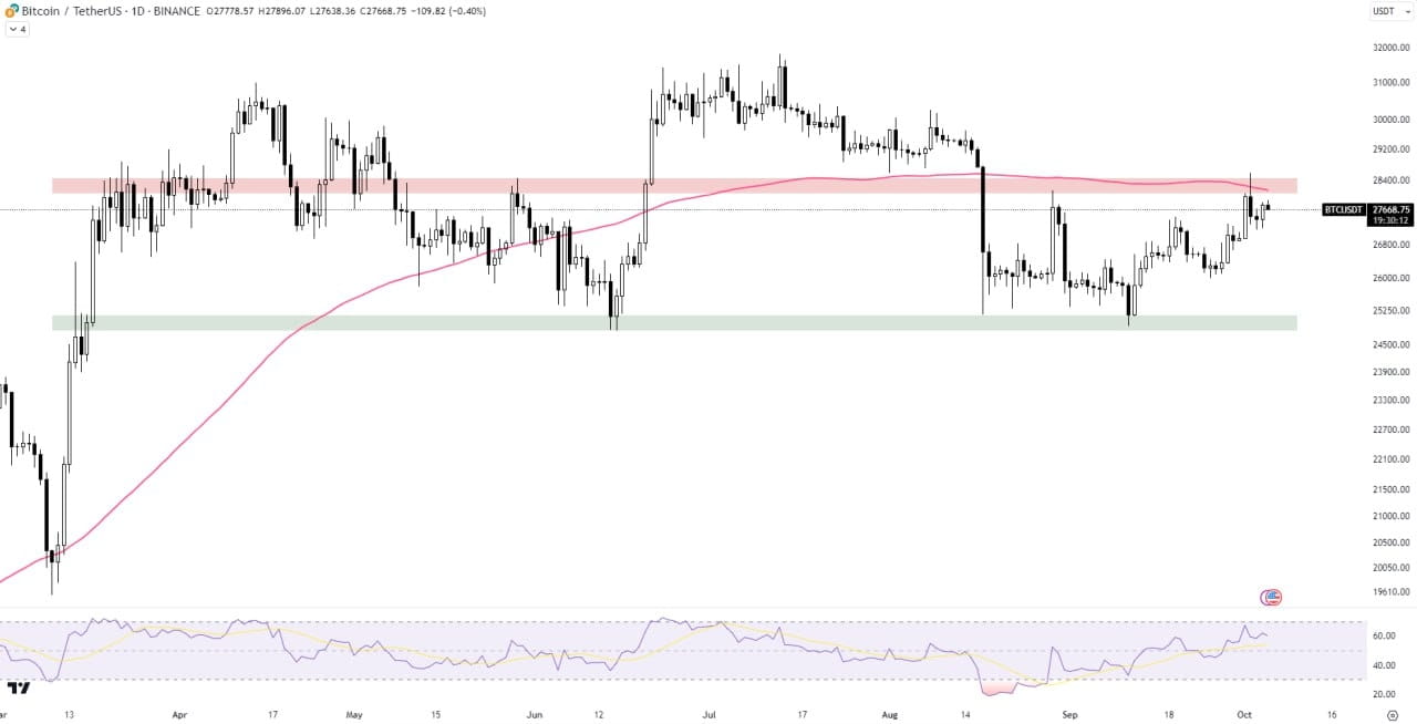 Биткойн в настоящее время переживает решающий момент, стремясь преодолеть горизонтальное сопротивление. Примечательно, что MA 100 оказывается серьезным барьером. RSI вошел в зону перекупленности, сигнализируя о потенциальной осторожности.