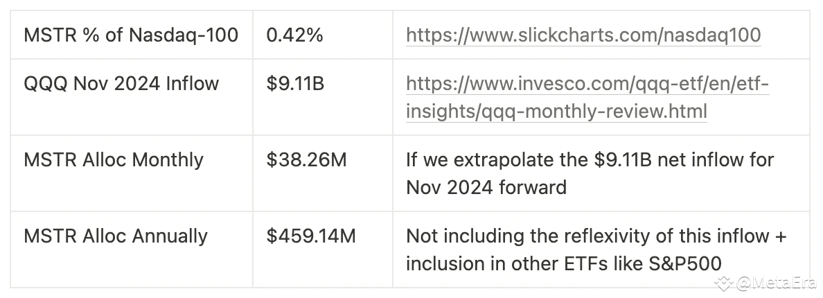 Примечание Odaily: принимая во внимание, что MSTR составляет 0,42% от индекса Nasdaq 100, чистый приток в QQQ в 2024 году составит 9,11 миллиарда долларов, что соответствует чистому притоку MSTR в 38,26 миллиона долларов в месяц, или 459 миллионов долларов в год.
