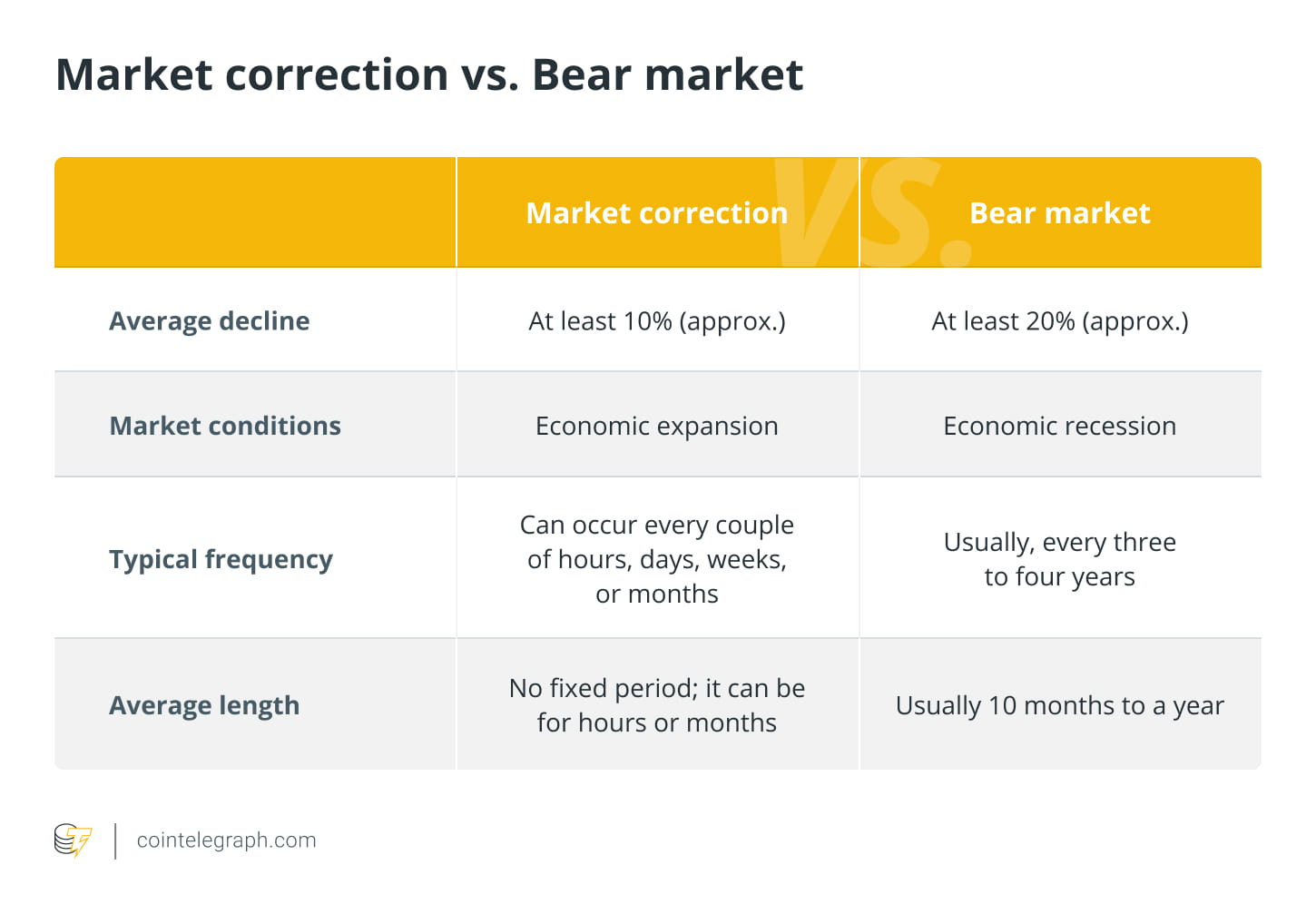 Что касается времени восстановления, рынки, как правило, восстанавливаются после коррекций быстрее — обычно в течение нескольких месяцев. Однако медвежьи рынки оказывают большее влияние на рынок из-за их большей продолжительности и большего снижения цен. В результате восстановление после недавнего медвежьего рынка может занять от нескольких месяцев до нескольких лет.