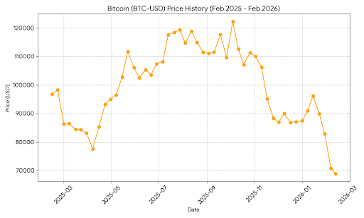 Цены на биткойн резко упали с максимумов конца 2025 года, опустившись ниже ключевых уровней поддержки около $66,000–$70,000, потеряв почти половину своей пикового значения. Недавние предупреждения аналитиков даже подчеркивают потенциальные более глубокие падения к $31,000, если медвежьи динамики сохранятся.