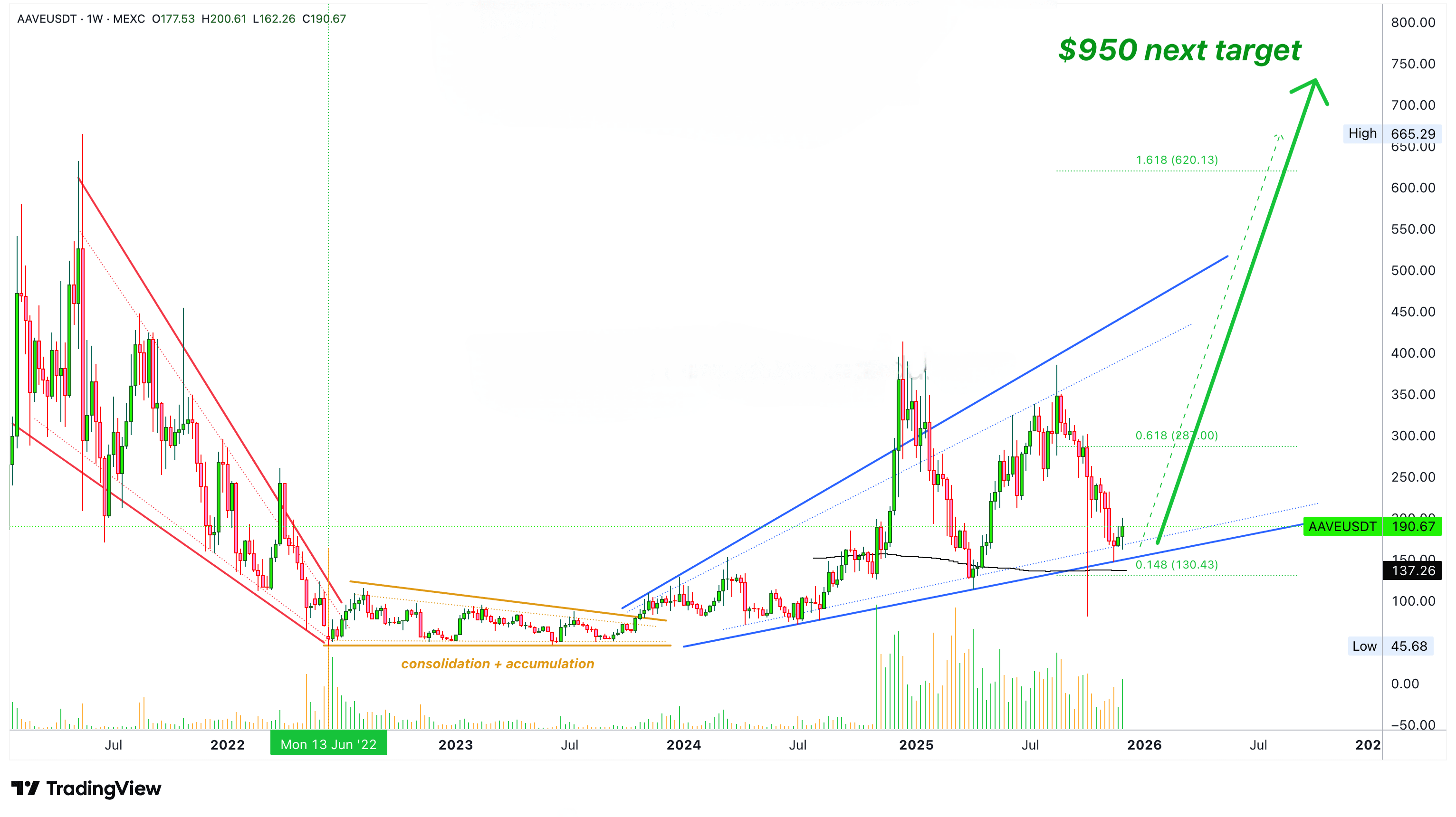 AAVEUSDT достиг дна в июне 2022 года. После этой даты. Никаких новых минимумов. Был период консолидации и накопления на низких ценах до конца 2023 года, когда рынок стал бычьим. У нас есть более высокие минимумы в долгосрочной перспективе.