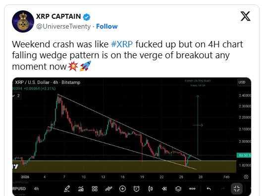 Криптоаналитик XRP Captain (@UniverseTwenty) отметил эту установку, указав, что XRP "на грани прорыва в любой момент".