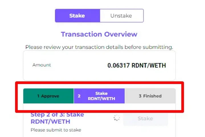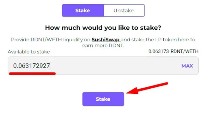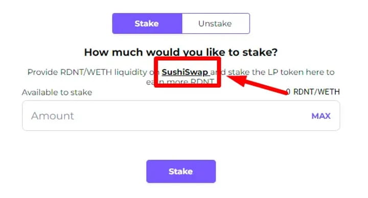 Чтобы принять участие в стейкинге, вам необходимо добавить ликвидность в пул WETH/RDNT SushiSwap, используя сеть Arbutrum.