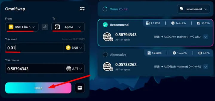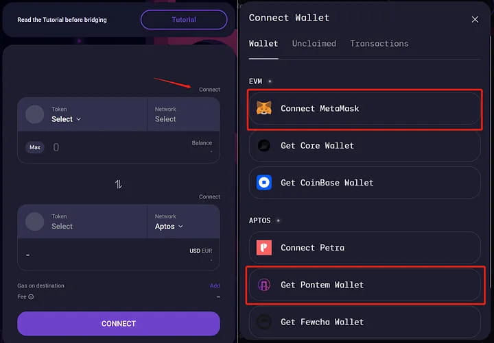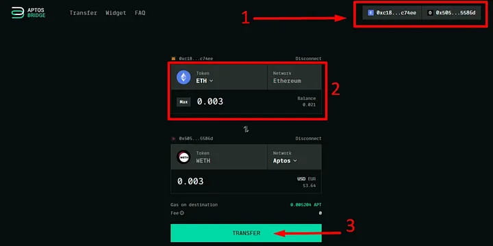 1. Подключите кошелек MetaMask и любой кошелек Aptos 2. Выберите сеть и задайте количество токенов 3. Обменяйтесь